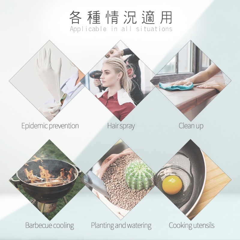Scope of application: Disinfection and epidemic prevention, hair styling, cleaning, barbecue cooling, meat planting, cooking utensils