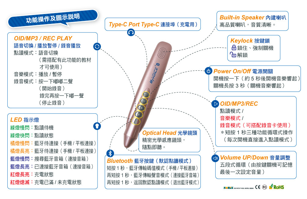 不用帶光碟機,也不用CD。My VOICE Pro讓學習變容易!「My VOICE Pro數位學習藍牙智慧筆」是專為學習語言所研發的新一代電子產品,透過精密且高品質的光學鏡頭,隨點即聽,最能符合快速、大量、有效學習的需求。